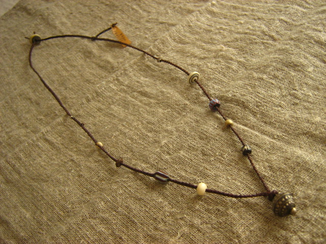 ← → プツプツとした トップのアンティークビーズ。。 どこの国からやってきたのか 渋い色めのチャームです まわりはヴェネチア アンティークビーズの カンネ(筋玉)やボーンビーズ などの落ち着いた色で仕上げました