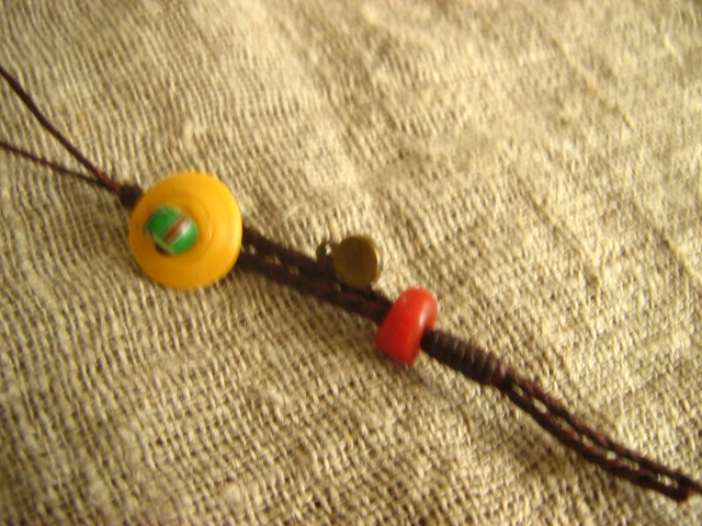 ← → レトロなボタンをイメージして・・・ 山吹色のディスク型 アンティークビーズに グリーンのカンネッテをのせ ボタンのように・・・